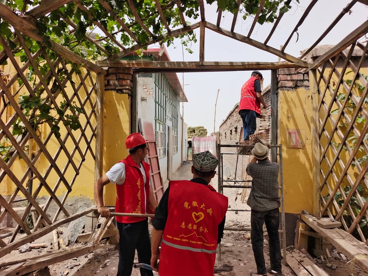 图:阿克陶县玉麦镇霍伊拉艾日克村驻村工作队队员帮助村民维修房门